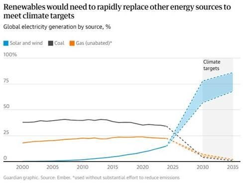 [Es preciso que las energías renovables sustituyan rápidamente a otras fuentes de energía para cumplir los objetivos climáticos / Generación mundial de electricidad en %]