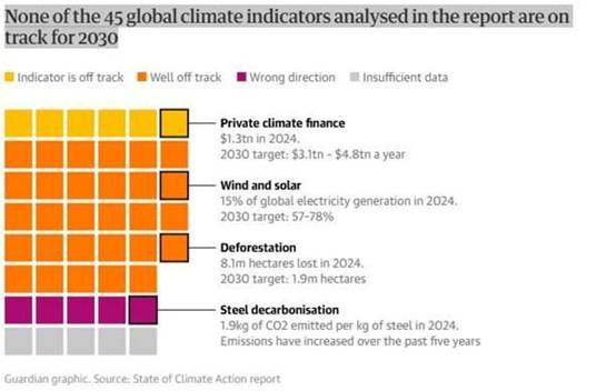 [Ninguno de los 45 indicadores globales analizados en el informe van camino de cumplir los objetivos: Financiación climática privada / Eólica y solar / Deforestación / Descarbonización del acero]