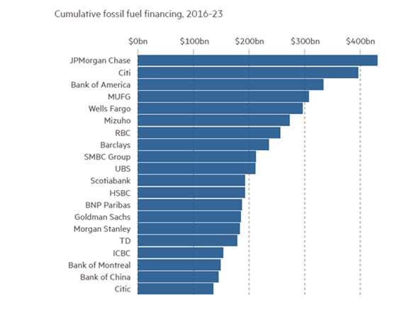 Los bancos comerciales están apoyando esta expansión, y los 40 principales prestamistas del sector de los combustibles fósiles invertirán colectivamente en 2024 la cifra más alta de los últimos cinco años, 611.000 millones de dólares.